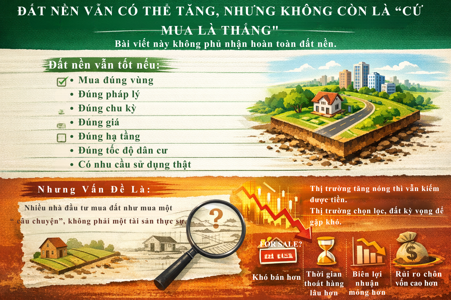 Nói cách khác, đất nền không xấu. Điều quan trọng là phải phân biệt rõ giữa đất nền có giá trị thật và đất nền chỉ được nuôi bằng kỳ vọng. Trong bối cảnh thị trường 2026, ai mua đúng tài sản sẽ có cơ hội thắng lớn trong dài hạn; còn ai chỉ mua theo câu chuyện, khả năng cao sẽ phải trả giá bằng thời gian, chi phí cơ hội và áp lực dòng tiền.