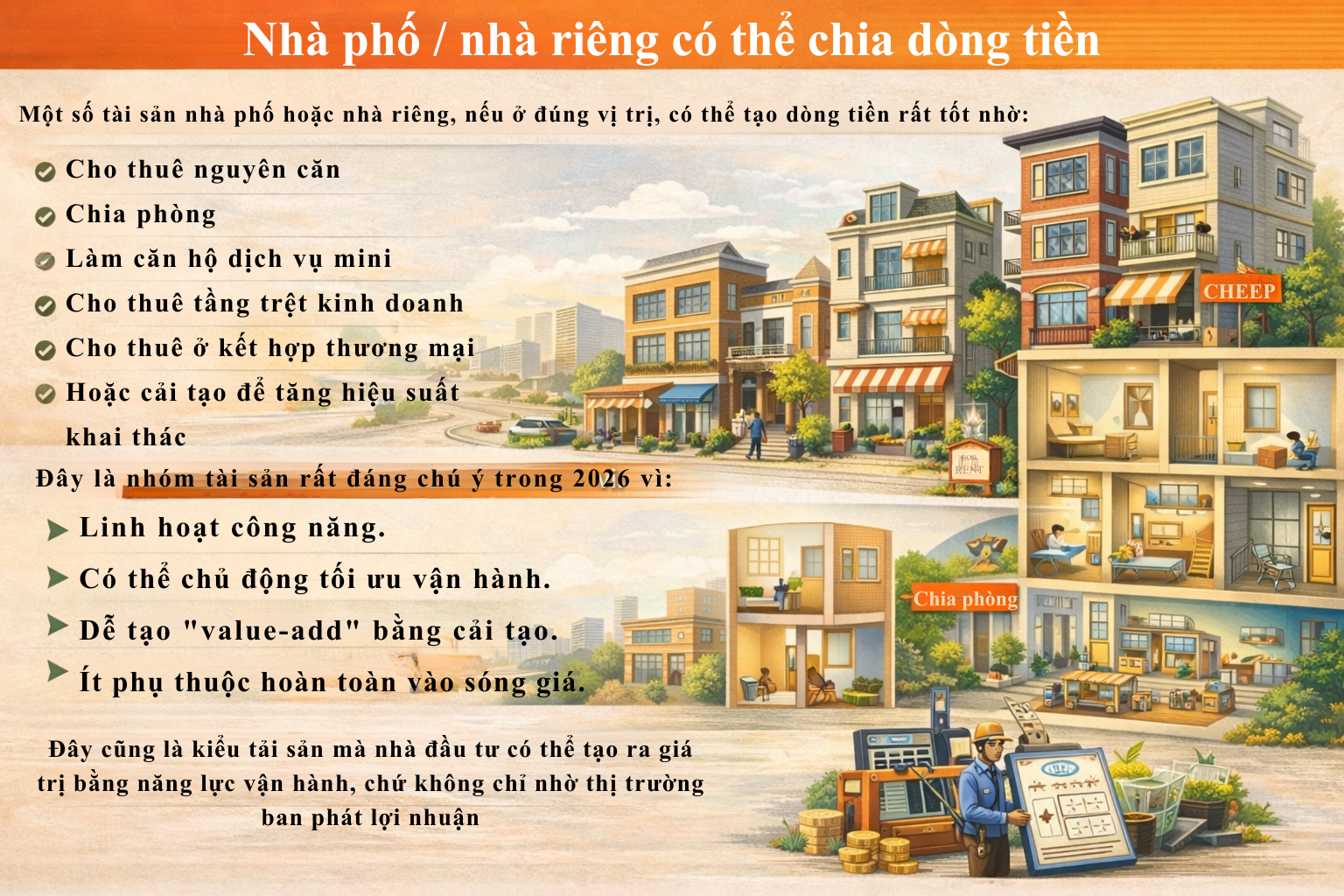 Đây chính là lý do vì sao nhóm tài sản này trở nên đặc biệt đáng chú ý trong năm 2026. Thị trường hiện nay không còn dễ dàng như giai đoạn trước, khi nhiều người chỉ cần mua đúng sóng là có thể thắng. Trong bối cảnh mới, những tài sản có khả năng tự tạo giá trị sẽ ngày càng được đánh giá cao hơn. Nhà phố và nhà riêng có thể chia dòng tiền là một ví dụ điển hình, bởi chúng có công năng linh hoạt, có thể chủ động tối ưu vận hành, dễ tạo “value-add” thông qua cải tạo, và ít phụ thuộc hoàn toàn vào sóng tăng giá của thị trường. Thay vì ngồi chờ thị trường ban phát lợi nhuận, nhà đầu tư có thể chủ động tăng giá trị tài sản bằng chính năng lực khai thác của mình.