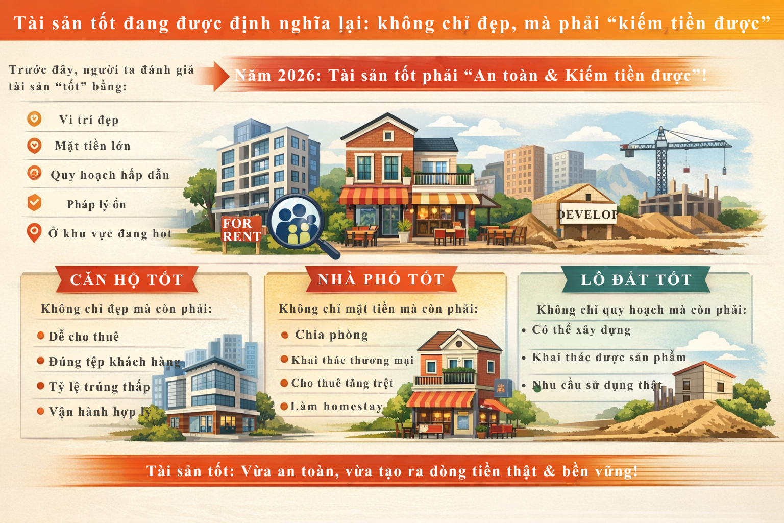 Nói ngắn gọn, trong năm 2026, một tài sản tốt không còn là tài sản “nghe hấp dẫn”, mà là tài sản vừa an toàn, vừa tạo được tiền, vừa có khả năng sống tốt qua nhiều trạng thái của thị trường. Và đó mới là tiêu chuẩn của một bất động sản thật sự đáng đầu tư trong chu kỳ mới.
