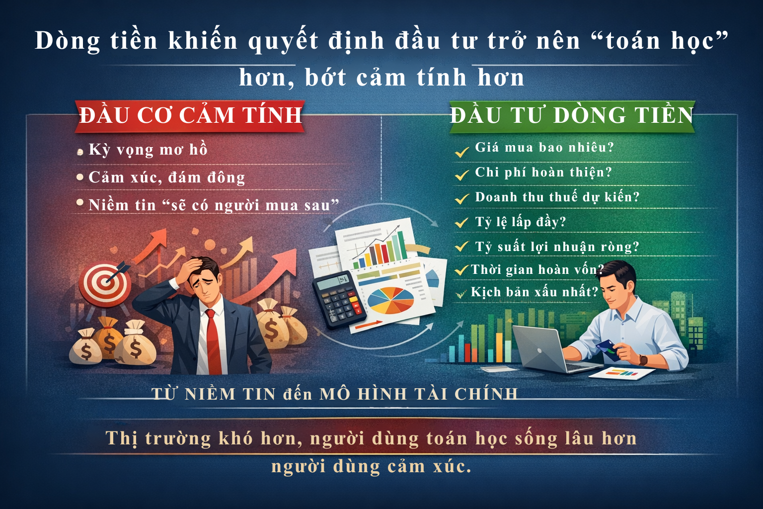 Trong một thị trường dễ tăng, cảm xúc có thể giúp bạn kiếm tiền nhanh. Nhưng trong một thị trường khó, phân hóa và chậm thanh khoản, chỉ những người có khả năng phân tích bằng con số mới giữ được lợi thế dài hạn. Nói cách khác, khi thị trường khó hơn, những người dùng toán học sẽ sống sót lâu hơn những người dùng cảm xúc. Và đó cũng là lý do vì sao, trong chu kỳ mới của bất động sản, tư duy đầu tư dòng tiền đang ngày càng trở thành nền tảng quan trọng hơn bao giờ hết.