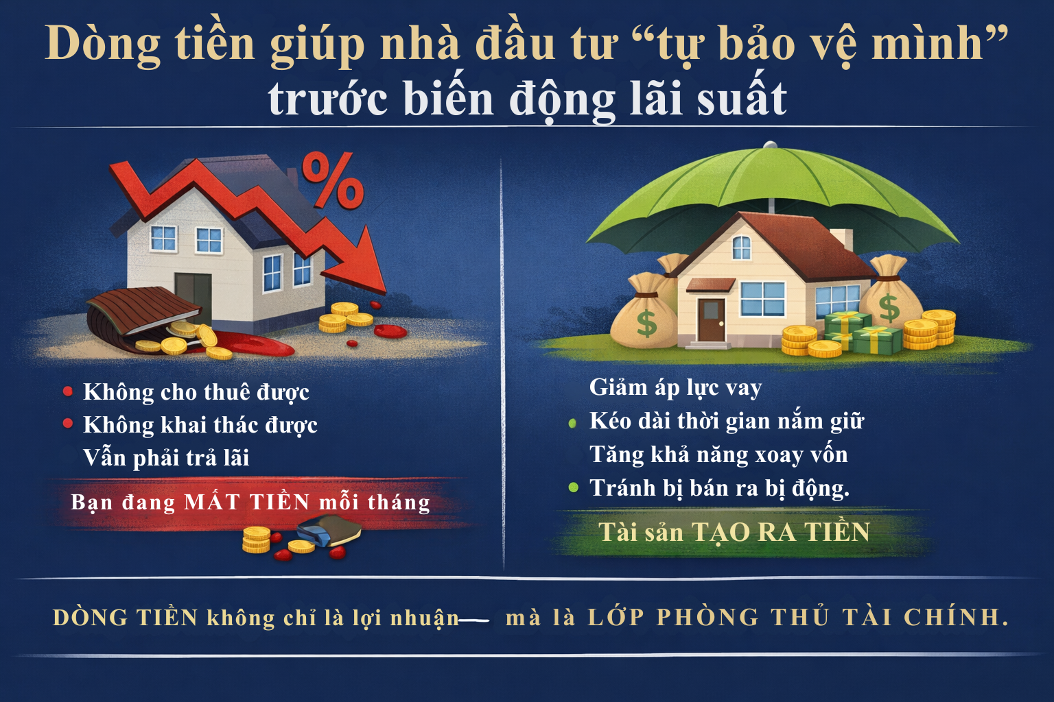 Đó là lý do vì sao, trong môi trường đầu tư mới, dòng tiền trở thành lớp phòng thủ tài chính cực kỳ quan trọng. Một tài sản tạo được dòng tiền tốt sẽ giúp nhà đầu tư giảm áp lực vay, bởi một phần hoặc phần lớn chi phí lãi vay có thể được bù đắp từ chính nguồn thu khai thác. Điều này giúp bạn kéo dài thời gian nắm giữ, không bị rơi vào trạng thái phải bán sớm chỉ vì áp lực tài chính. Đồng thời, dòng tiền còn giúp tăng khả năng xoay vòng vốn, bởi khi tài sản tạo ra tiền đều đặn, bạn có thể tái đầu tư, dự phòng rủi ro hoặc chuẩn bị cho những cơ hội tốt hơn trong tương lai.