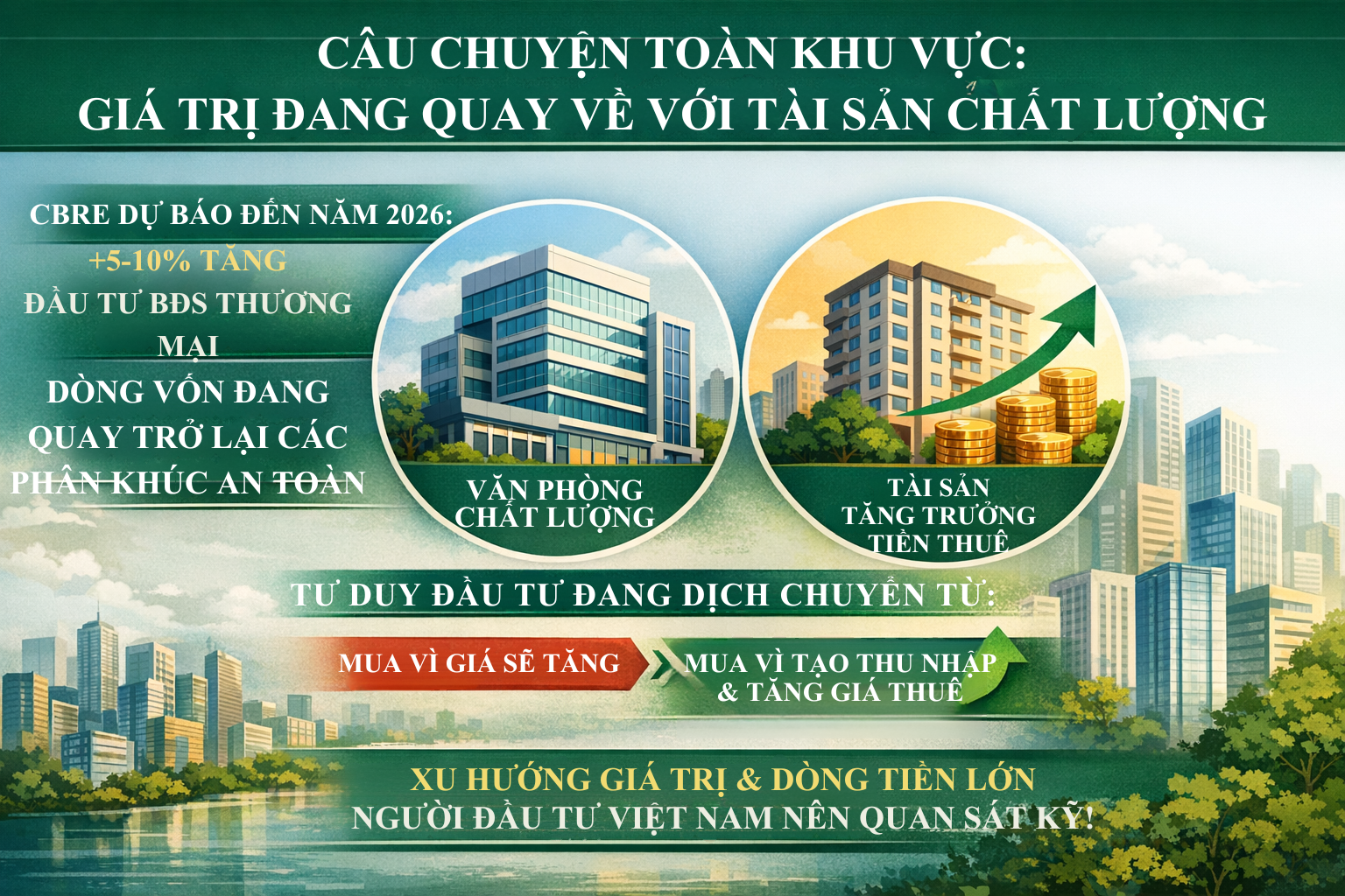 Trên bình diện khu vực châu Á – Thái Bình Dương, những tín hiệu mới từ các tổ chức nghiên cứu lớn đang cho thấy một sự dịch chuyển rất đáng chú ý trong tư duy đầu tư bất động sản. Theo nhận định của CBRE, hoạt động đầu tư vào bất động sản thương mại trong năm 2026 có thể tăng khoảng 5–10%, cho thấy dòng vốn đang dần quay trở lại sau giai đoạn thận trọng kéo dài. Tuy nhiên, điều quan trọng không chỉ nằm ở việc dòng tiền quay lại, mà nằm ở nơi dòng tiền đang chọn để đổ vào. Thay vì lan tỏa một cách đại trà như các chu kỳ tăng nóng trước đây, dòng vốn hiện tại đang có xu hướng tập trung mạnh hơn vào những phân khúc có khả năng khai thác ổn định, dòng tiền rõ ràng và tiềm năng tăng trưởng tiền thuê bền vững. Trong đó, các tài sản như văn phòng chất lượng tốt, bất động sản có vị trí vận hành hiệu quả, hoặc các sản phẩm có thể tối ưu khai thác đang được đánh giá cao hơn rất nhiều so với những tài sản chỉ mang tính kỳ vọng tăng giá.