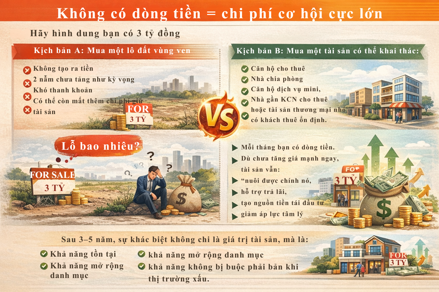 Một trong những sai lầm phổ biến nhất của rất nhiều nhà đầu tư bất động sản là chỉ nhìn vào khả năng tăng giá trong tương lai, mà bỏ qua một yếu tố cực kỳ quan trọng: dòng tiền hiện tại. Trên lý thuyết, một tài sản có thể tăng giá mạnh sau vài năm nghe có vẻ rất hấp dẫn. Nhưng trong thực tế đầu tư, nếu một tài sản không tạo ra tiền trong suốt thời gian nắm giữ, thì nhà đầu tư đang phải chấp nhận một chi phí cơ hội rất lớn – và đôi khi đó mới là khoản “mất” lớn nhất, dù nhìn bề ngoài vẫn chưa thấy lỗ.