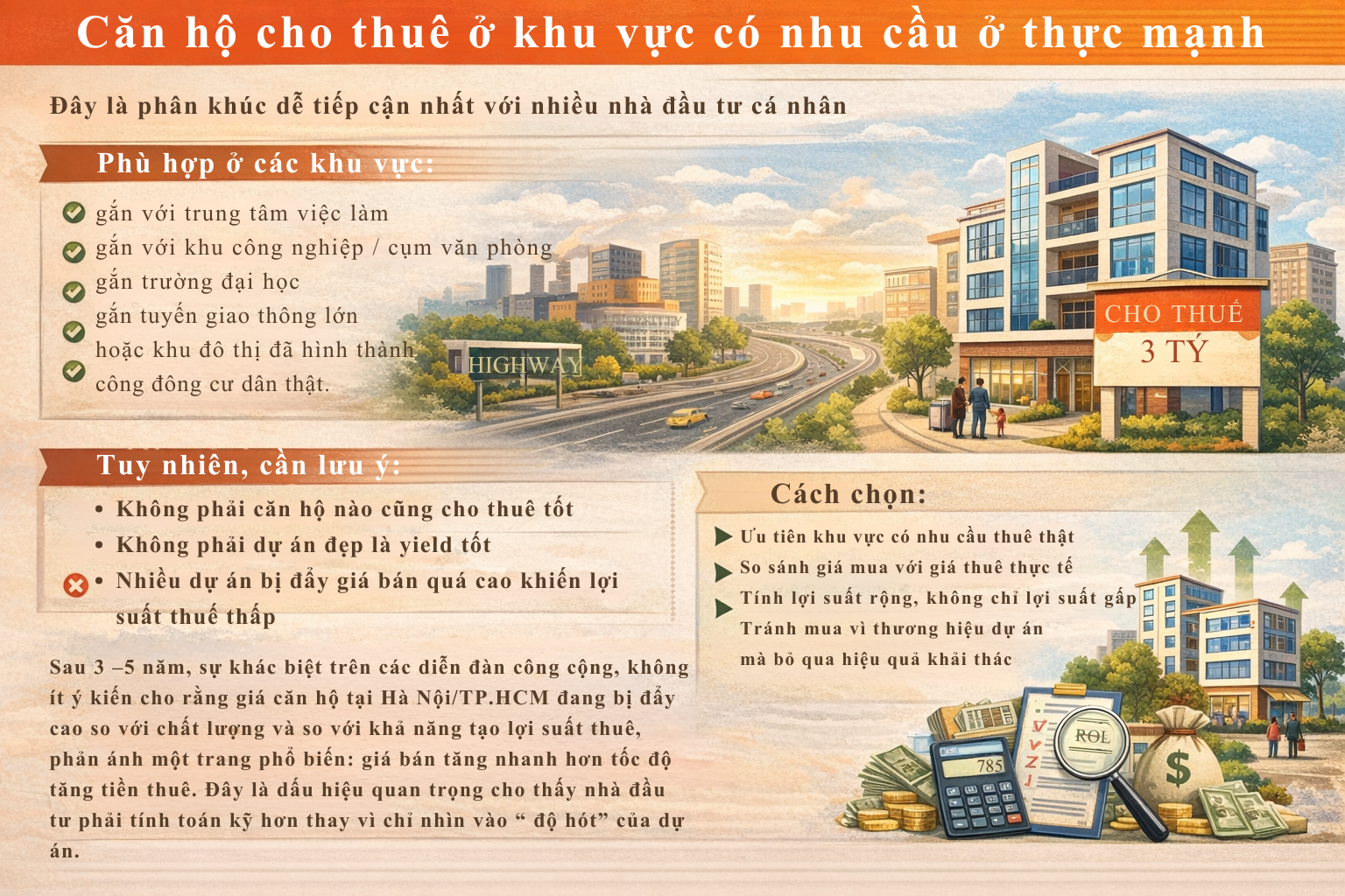 Phân khúc này đặc biệt phù hợp ở những khu vực có nguồn cầu thuê bền vững, chẳng hạn như nơi gần trung tâm việc làm, gần khu công nghiệp hoặc cụm văn phòng lớn, gần trường đại học, gần các tuyến giao thông huyết mạch, hoặc nằm trong các khu đô thị đã hình thành cộng đồng cư dân thật. Đây là những nơi mà nhu cầu thuê không chỉ đến từ một nhóm khách ngắn hạn, mà được tạo ra bởi nhu cầu sinh sống, học tập, làm việc và di chuyển hàng ngày. Khi một khu vực có dòng người vào ở thật, có công việc thật, có dịch chuyển dân cư thật, thì khả năng khai thác cho thuê của căn hộ thường ổn định hơn rất nhiều so với những dự án chỉ đẹp trên phối cảnh hoặc được quảng bá mạnh trên truyền thông.