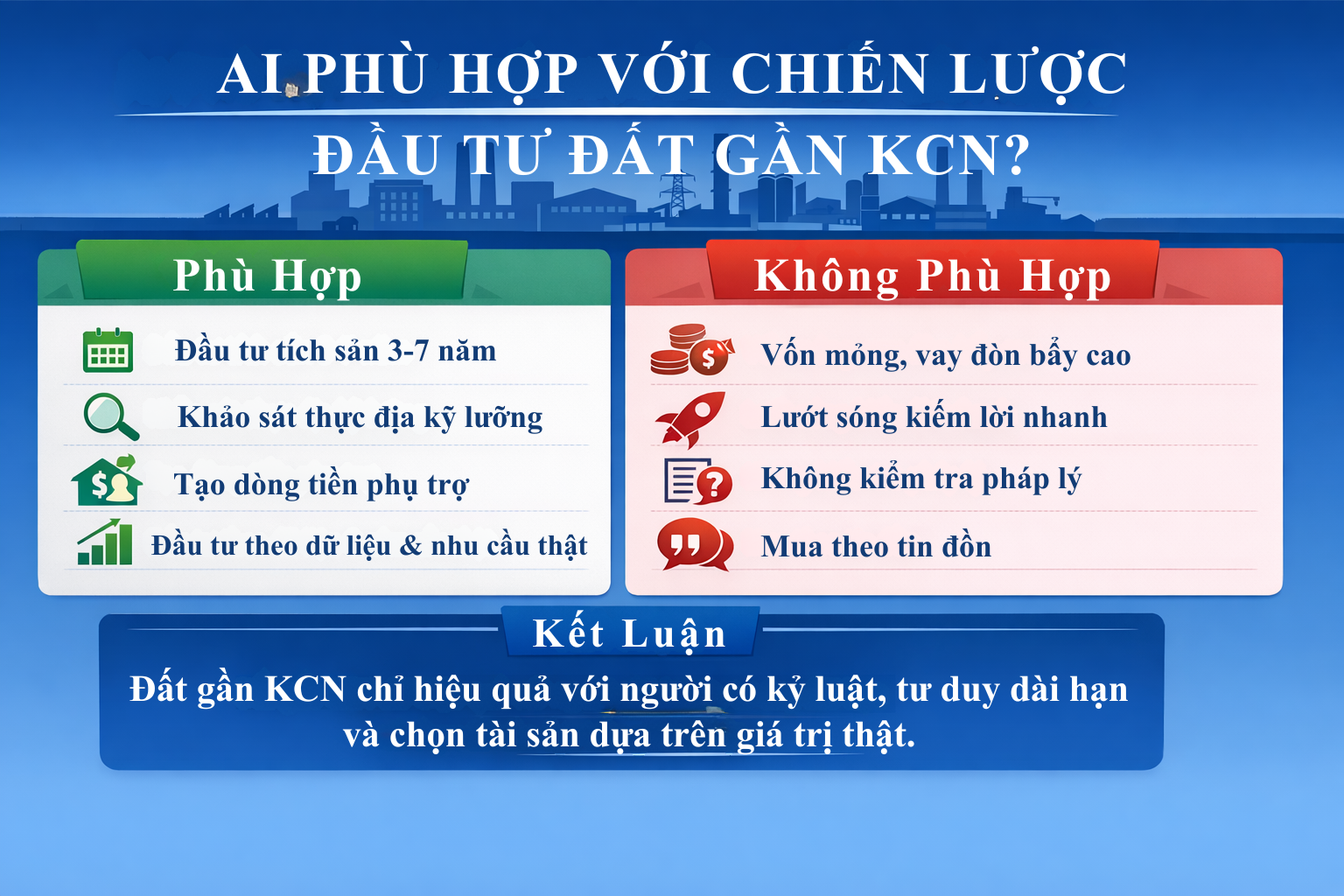 Dù có nhiều rủi ro và dễ bị đẩy giá theo tin đồn, nhưng nếu chọn đúng khu vực, đầu tư đất gần KCN vẫn có thể là một chiến lược rất hiệu quả trong chu kỳ 2026–2030. Điểm quan trọng là nhà đầu tư phải hiểu rằng cơ hội thật không nằm ở việc “nghe nói sắp có KCN”, mà nằm ở những nơi đã hoặc đang hình thành nhu cầu thực rõ ràng. Khi một khu công nghiệp vận hành tốt, có tỷ lệ lấp đầy cao, doanh nghiệp hoạt động ổn định và dòng lao động – chuyên gia – dịch vụ phụ trợ bắt đầu đổ về, khu vực xung quanh sẽ dần xuất hiện những nhu cầu rất cụ thể. Và chính những nhu cầu này mới là nền tảng tạo nên giá trị bền vững cho bất động sản.