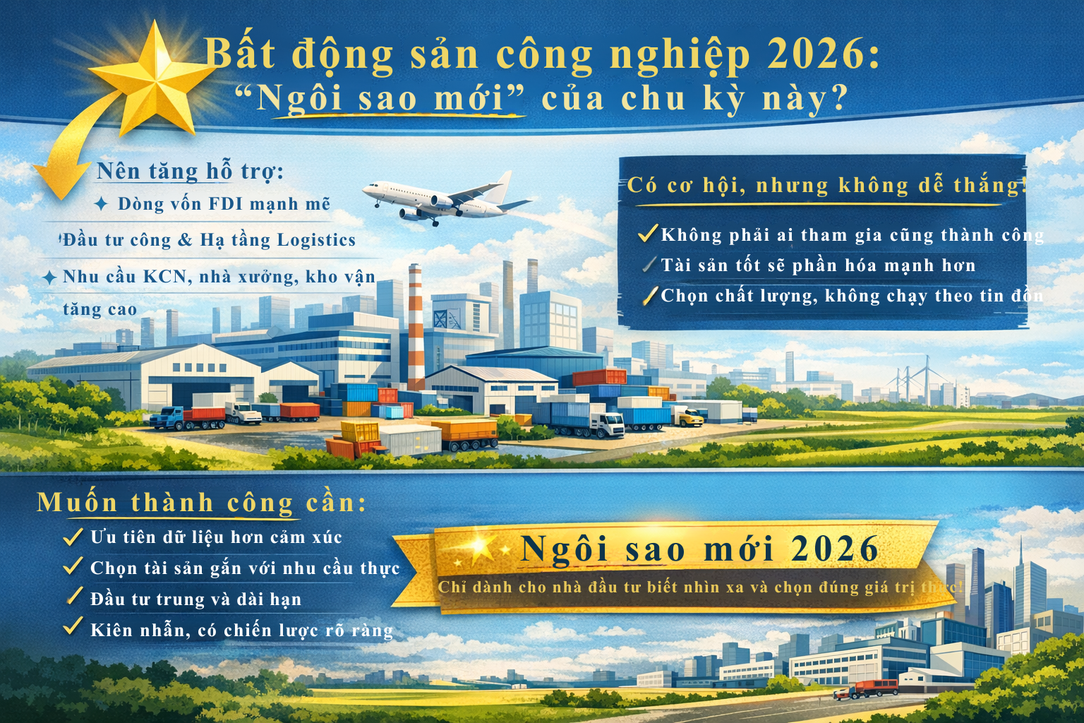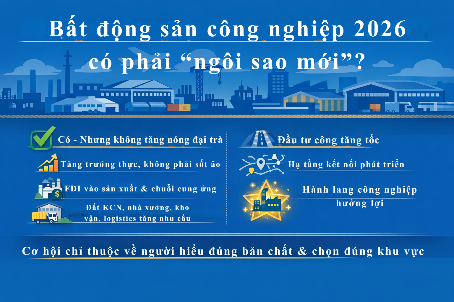 Bất động sản công nghiệp 2026 rất có thể là “ngôi sao mới” của thị trường, nhưng chỉ với những nhà đầu tư biết nhìn xa hơn đám đông, đi sâu hơn bề mặt thông tin và chọn đúng tài sản có giá trị thật.