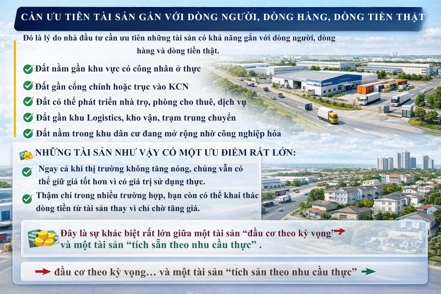 Đó là lý do nhà đầu tư cần ưu tiên những tài sản có khả năng gắn với dòng người, dòng hàng và dòng tiền thật. Ví dụ: