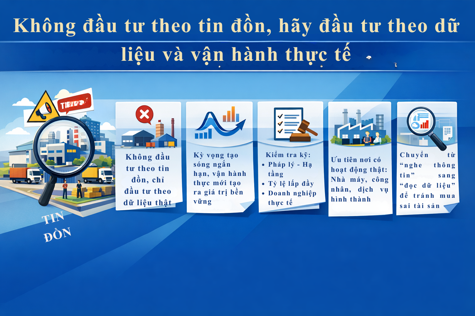 Trong bất động sản công nghiệp, một thông tin được nhắc nhiều chưa chắc đã là cơ hội thật. Một địa phương có quy hoạch khu công nghiệp chưa chắc sẽ phát triển nhanh. Một khu đất gần KCN chưa chắc sẽ tăng giá mạnh. Một vùng được nói là “hưởng lợi từ FDI” chưa chắc đã hình thành nhu cầu thực đủ lớn. Nếu nhà đầu tư chỉ nghe môi giới kể chuyện hoặc chỉ đọc các tiêu đề hấp dẫn mà không kiểm chứng, rất dễ mua phải tài sản mà giá đã bị đẩy lên trước cả khi giá trị thật hình thành.