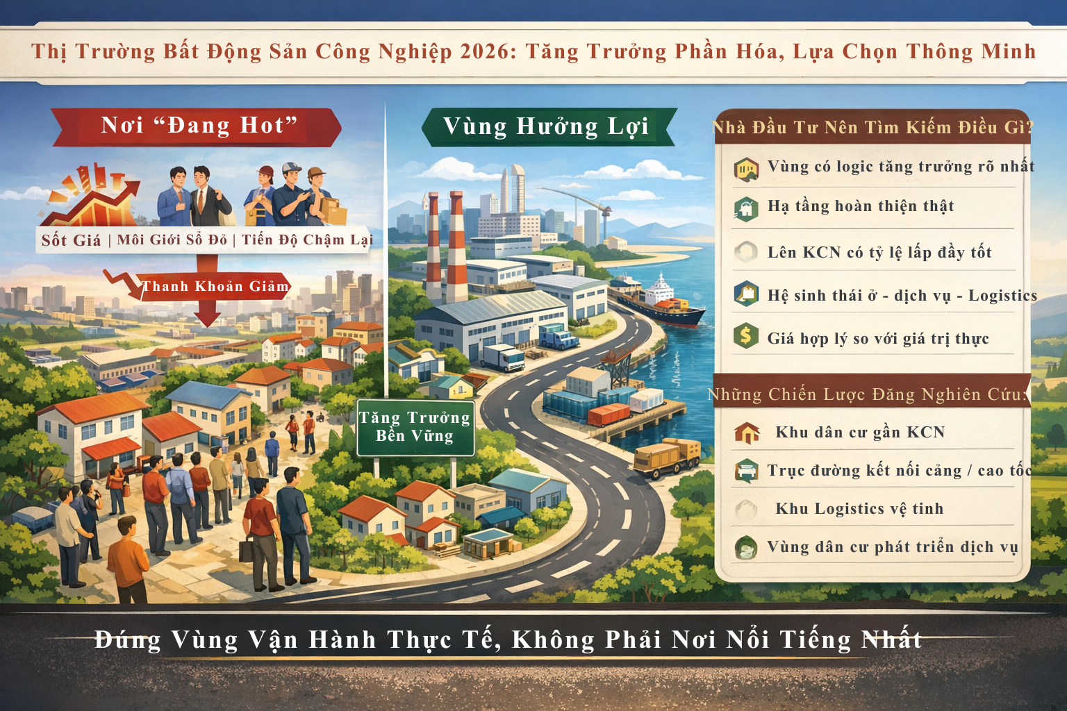Với nhà đầu tư cá nhân, sự chuyển dịch này mang ý nghĩa rất lớn. Năm 2026 không còn là thời điểm phù hợp cho chiến lược “nghe tin rồi mua”, đặc biệt với các tài sản quanh khu công nghiệp. Thay vào đó, người chiến thắng sẽ là người biết phân biệt giữa “câu chuyện công nghiệp” và “giá trị công nghiệp thực”. Một tài sản chỉ thực sự đáng đầu tư khi nó gắn với nhu cầu sử dụng rõ ràng: có thể làm kho, làm dịch vụ, làm nhà ở cho chuyên gia/công nhân, nằm gần trục logistics hoặc hưởng lợi thực sự từ hoạt động sản xuất đang diễn ra.
