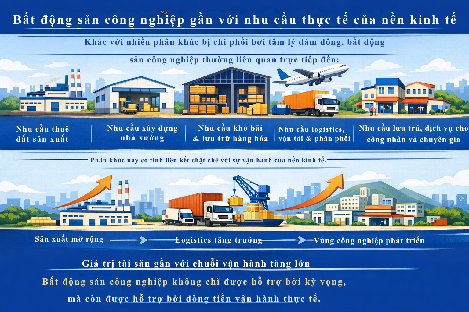 Nếu làm được điều đó, bất động sản công nghiệp hoàn toàn có thể trở thành một hướng đi rất đáng quan tâm trong chu kỳ mới của thị trường. Không chỉ vì tiềm năng tăng giá, mà còn vì đây là phân khúc gắn với sự phát triển thực của nền kinh tế, với sản xuất thực, logistics thực và nhu cầu sử dụng thực — những yếu tố luôn có sức bền cao hơn rất nhiều so với những cơn sóng đầu cơ ngắn hạn.