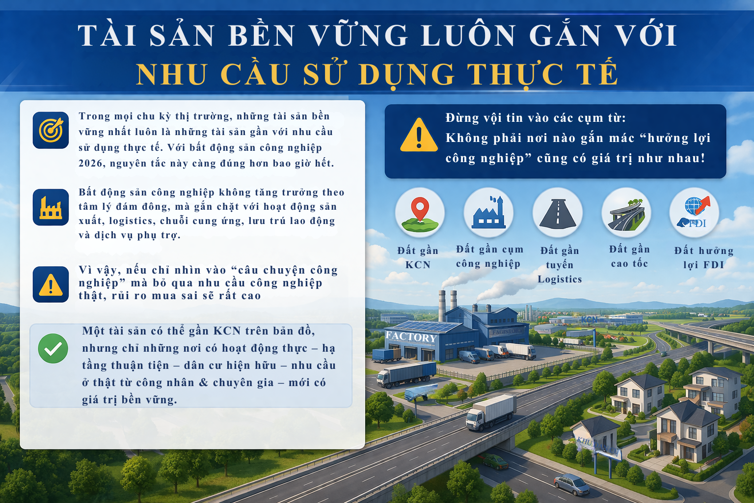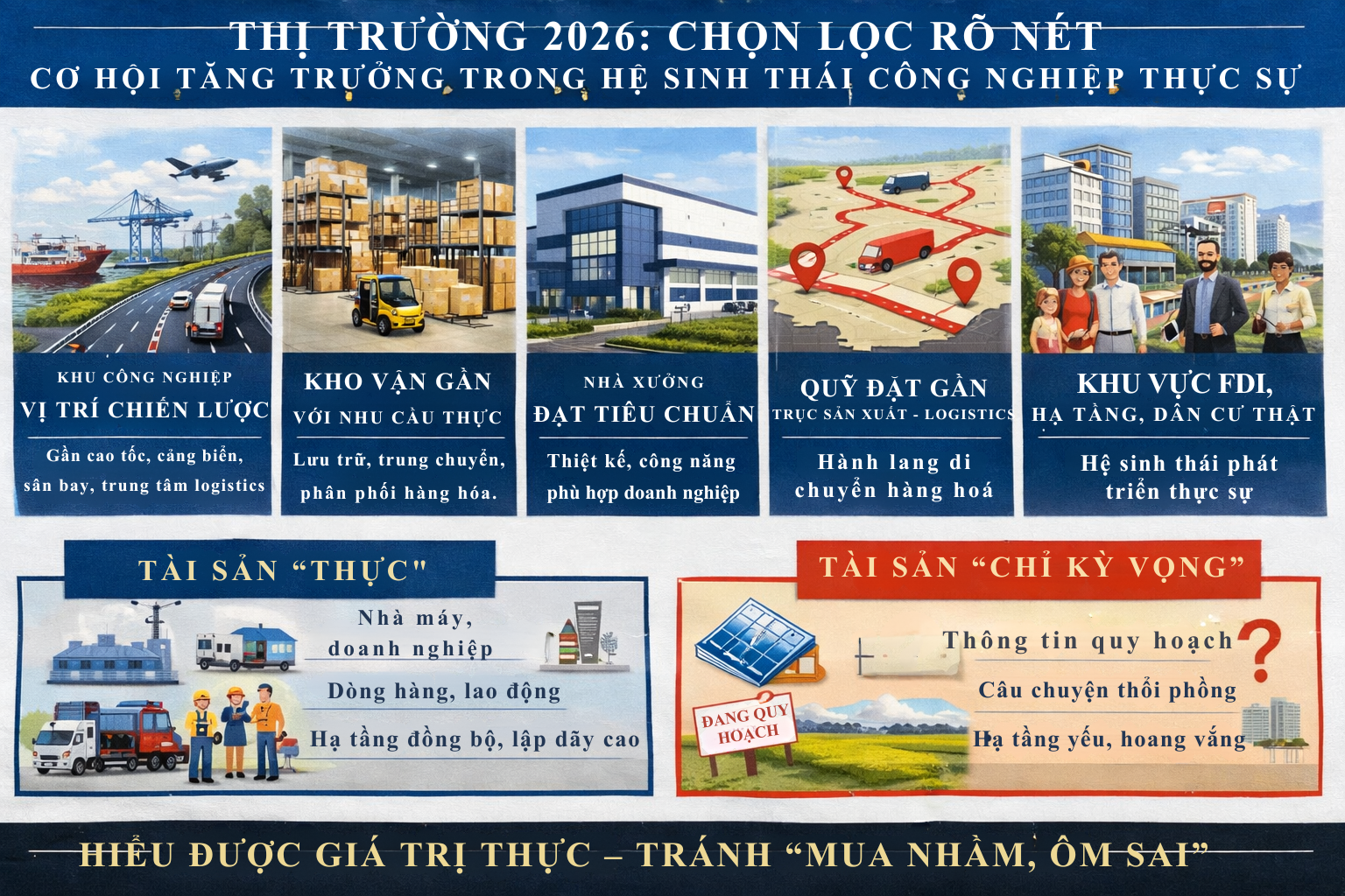 Trong năm 2026, khi thị trường ngày càng phân hóa, tài sản tốt không còn là tài sản được nói nhiều nhất, mà là tài sản phục vụ được nhu cầu thật nhất. Và đây chính là nguyên tắc cốt lõi để đầu tư an toàn hơn trong bất động sản công nghiệp.