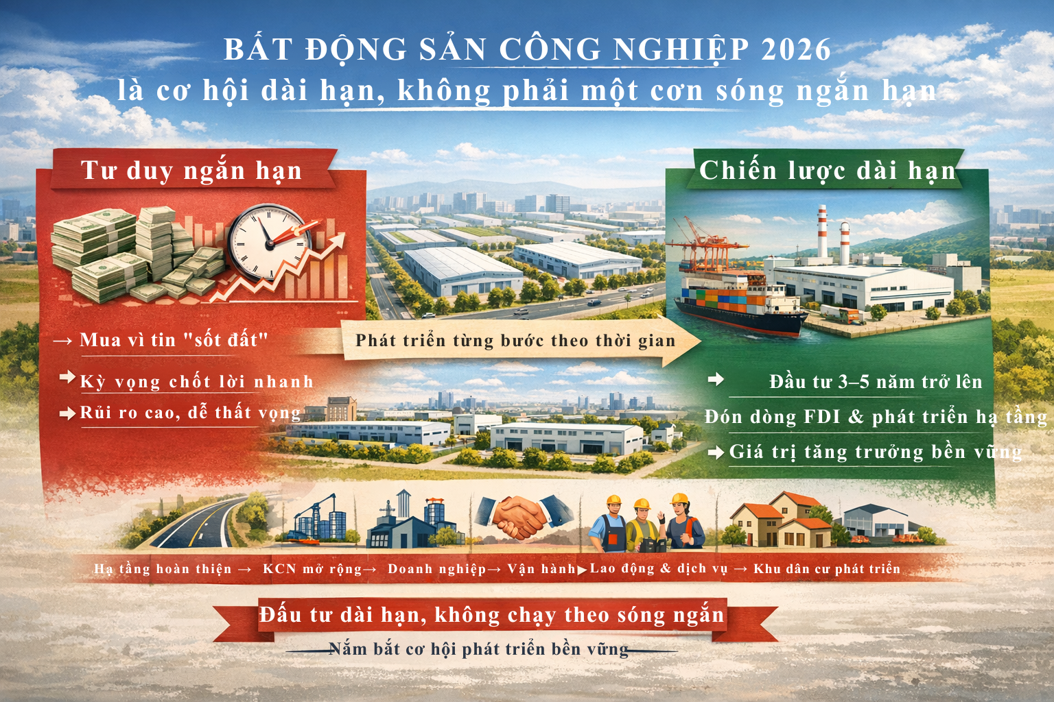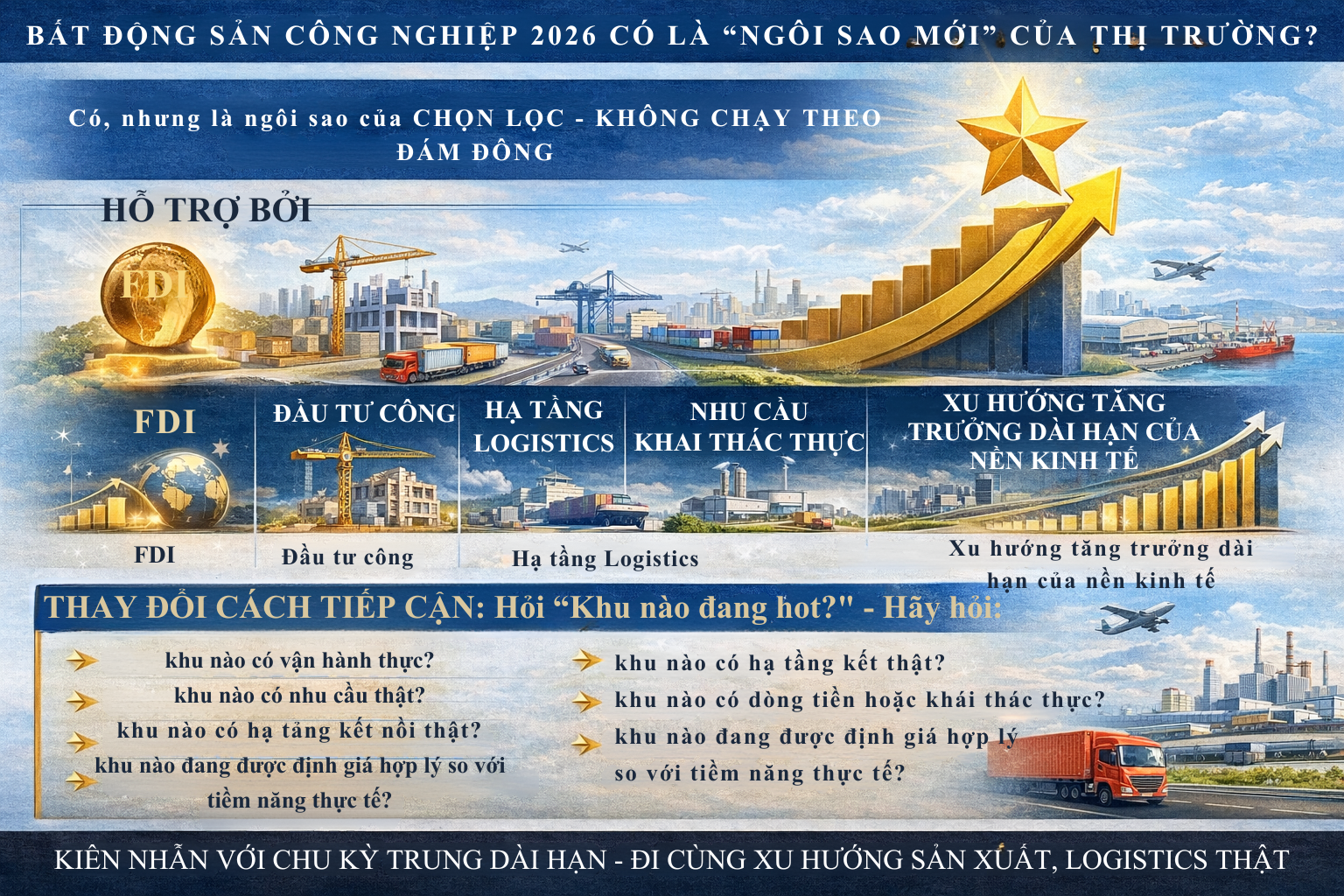 Nói ngắn gọn: bất động sản công nghiệp 2026 là một “câu chuyện phát triển”, không phải một “cơn sốt chớp nhoáng”. Ai tiếp cận bằng tư duy dài hạn sẽ có cơ hội tốt hơn. Ai tiếp cận bằng tâm lý lướt sóng có thể sẽ rất dễ thất vọng.