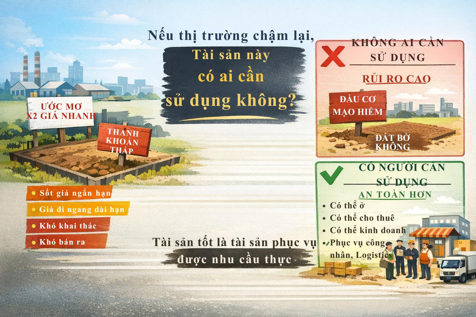 Những tài sản như vậy có một ưu điểm rất lớn: ngay cả khi thị trường không tăng nóng, chúng vẫn có thể giữ giá tốt hơn vì có giá trị sử dụng thực. Thậm chí trong nhiều trường hợp, bạn còn có thể khai thác dòng tiền từ tài sản thay vì chỉ chờ tăng giá. Đây là sự khác biệt rất lớn giữa một tài sản “đầu cơ theo kỳ vọng” và một tài sản “tích sản theo nhu cầu thực”.