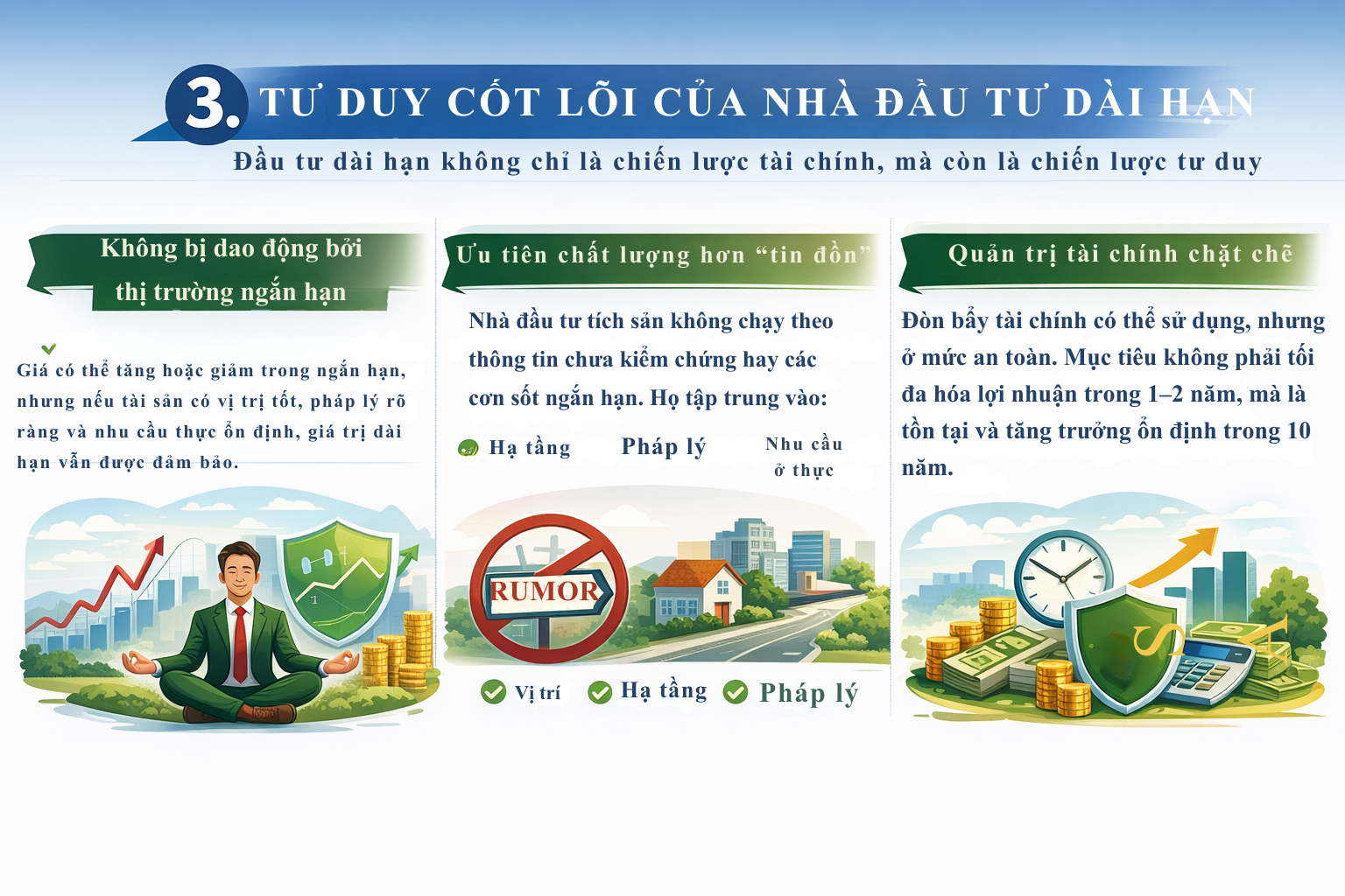 Tóm lại, tư duy dài hạn biến bất động sản thành một công cụ xây dựng tài sản bền vững. Khi kết hợp giữa kiến thức, kỷ luật và tầm nhìn, nhà đầu tư có thể tận dụng sức mạnh của thời gian để gia tăng giá trị tài sản một cách ổn định và an toàn.