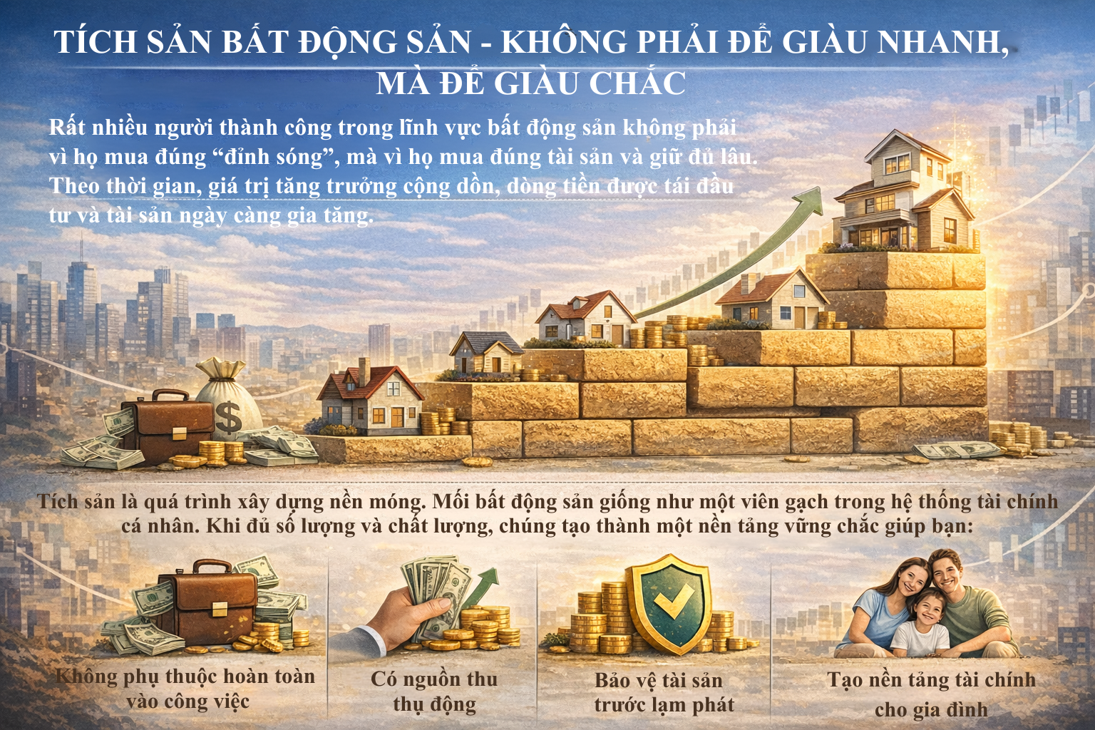 Giàu nhanh có thể hấp dẫn, nhưng thường đi kèm rủi ro cao. Giàu chắc là kết quả của sự bền bỉ, kỷ luật và tầm nhìn dài hạn. Tích sản bất động sản không phải là con đường ngắn nhất, nhưng là con đường vững vàng để xây dựng sự thịnh vượng lâu dài.