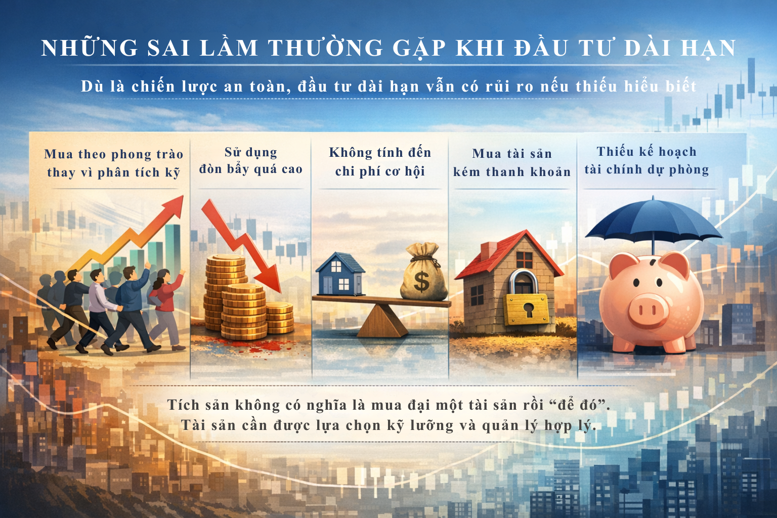Mặc dù đầu tư dài hạn và tích sản bất động sản được xem là chiến lược tương đối an toàn so với lướt sóng, nhưng điều đó không có nghĩa là không tồn tại rủi ro. Trên thực tế, nhiều nhà đầu tư thất bại không phải vì chiến lược sai, mà vì thực hiện sai cách hoặc thiếu sự chuẩn bị kỹ lưỡng. Đầu tư dài hạn đòi hỏi kiến thức, kỷ luật và sự tính toán cẩn trọng. Nếu chủ quan, nhà đầu tư vẫn có thể rơi vào những “bẫy” phổ biến.