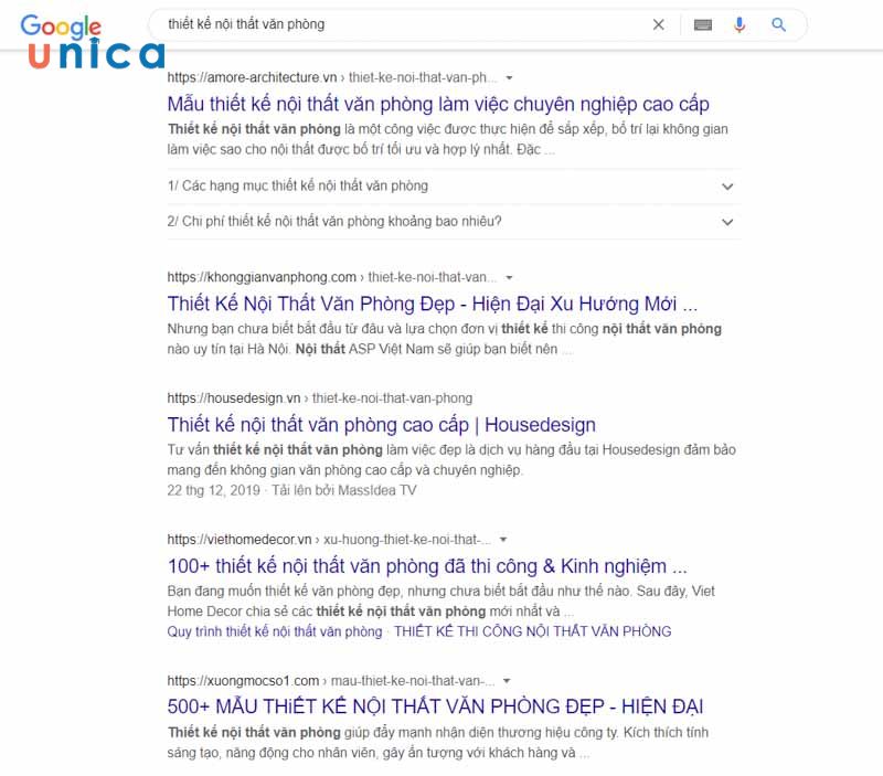 - Bước 1: Nhập từ khóa "thiết kế nội thất văn phòng" vào Google và nhấn tìm kiếm.