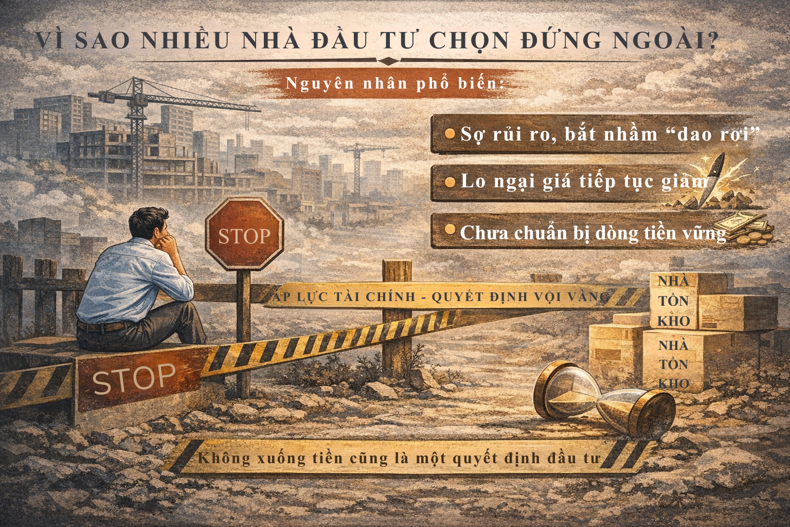 Việc đứng ngoài trong giai đoạn thị trường trầm lắng là một lựa chọn khá phổ biến, đặc biệt đối với những nhà đầu tư mới tham gia hoặc những người chưa có nhiều kinh nghiệm trải qua các chu kỳ lên – xuống của bất động sản. Khi thị trường không còn sôi động, thanh khoản giảm và thông tin tích cực trở nên khan hiếm, cảm giác bất an thường chiếm ưu thế trong tâm lý số đông. Nhà đầu tư lo ngại rằng giá có thể tiếp tục giảm sâu hơn, khiến khoản tiền mình bỏ ra bị “chôn vốn” trong thời gian dài. Đối với nhiều người, đặc biệt là những ai tích lũy vốn trong thời gian dài mới có được một khoản tiền để đầu tư, nỗi sợ mất tiền thậm chí còn lớn hơn mong muốn tìm kiếm lợi nhuận.