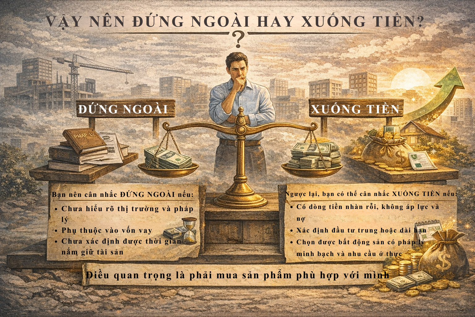 Không có một câu trả lời chung cho tất cả mọi người khi đứng trước câu hỏi nên xuống tiền hay tiếp tục quan sát thị trường. Bất động sản là một lĩnh vực chịu tác động bởi nhiều yếu tố như kinh tế vĩ mô, chính sách tín dụng, quy hoạch hạ tầng và cả tâm lý đám đông. Vì vậy, một quyết định có thể đúng với người này nhưng lại chưa phù hợp với người khác. Điều quan trọng nhất không nằm ở việc thị trường đang sôi động hay trầm lắng, mà nằm ở chính nội lực của mỗi cá nhân: năng lực tài chính đến đâu, mức độ hiểu biết thị trường như thế nào và mục tiêu đầu tư hướng tới là ngắn hạn, trung hạn hay dài hạn.