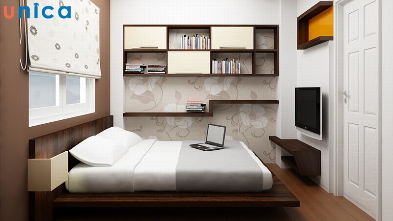 Phòng ngủ: Nội thất tối giản, giường đa năng và tông màu trung tính tạo cảm giác thư giãn.