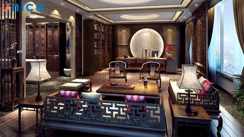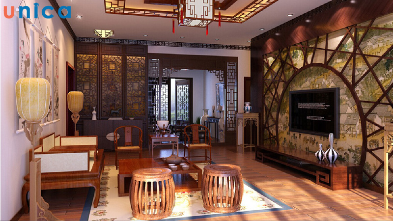 Phong cách nội thất Trung Quốc nổi bật với sự cân bằng và hài hòa trong bố cục. Những chi tiết như vách ngăn, bàn trà thấp, và các họa tiết chạm khắc truyền thống tạo nên không gian tinh tế, cổ điển mà vẫn mang tính hiện đại. Sử dụng các gam màu đỏ, đen, và vàng ánh kim là điểm nhấn, kết hợp cùng đồ nội thất gỗ và các vật liệu tự nhiên khác để tăng thêm phần sang trọng.