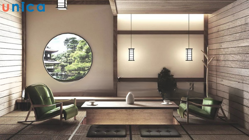 Phong cách Nhật Bản với lối bài trí tối giản, sử dụng các vật liệu thiên nhiên như tre, gỗ, kết hợp gam màu nhẹ nhàng, tạo không gian yên tĩnh và thư giãn.