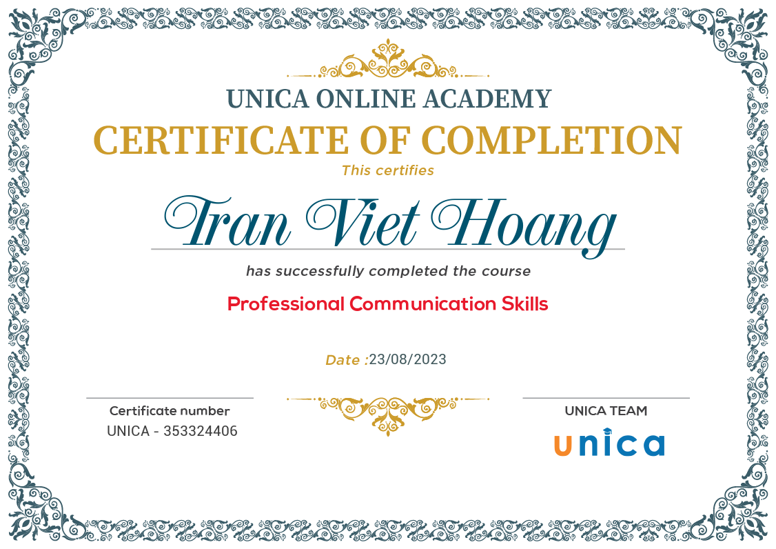 Chứng nhận Trần Việt Hoàng hoàn thành khóa học Kỹ năng giao tiếp thông minh tại Unica. Nâng tầm bản thân với 2000+ khóa học online từ Unica. Mua 1 Lần Học Trọn Đời, Nhận Chứng Chỉ Hoàn Thành Sau Khóa Học