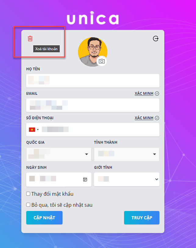 Xin lưu ý rằng bằng cách đóng tài khoản Unica, bạn sẽ mất quyền truy cập vào tất cả các khóa học bạn đã đăng ký, bao gồm cả các khóa học đã mua.